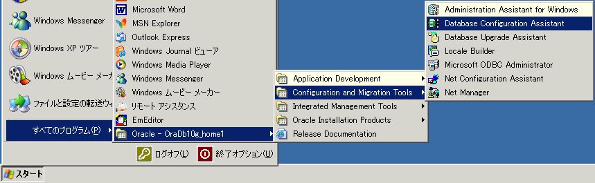 スタートメニューから「すべてのプログラム」→「Oracle - OraDb10g_home1」→「Configuration and Migration Tools」→「Database Configuration Assistant」を選び、クリック。