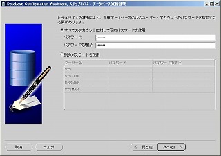 「すべてのアカウントに対して同じパスワードを使用」にチェックが入っていることを確認し、パスワードに「oracle」と入力し、「次へ」をクリック。