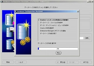 Database Configuration Assistantウィンドウが開き、データベースの作成処理が行われる。作成には30〜40分程度かかる。 2-14 データベース作成完了