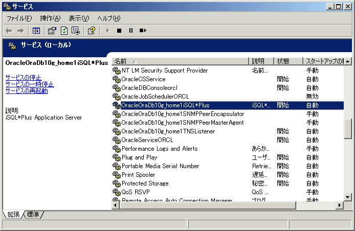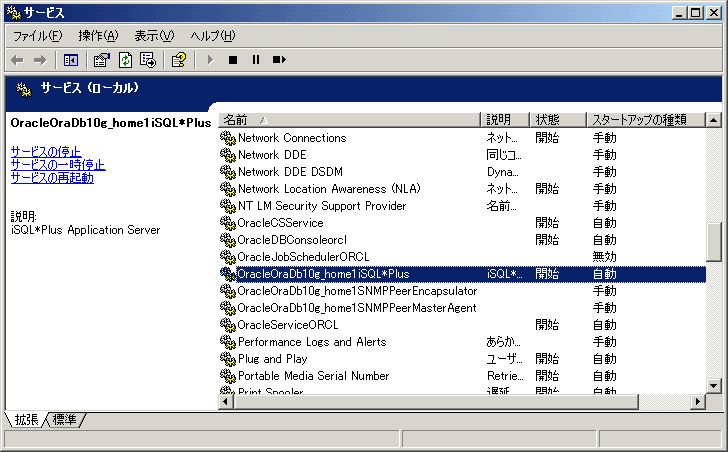 iSQL*Plusを利用するには、Oracleがインストールされているサーバ上で、iSQL*Plusのサービスが起動している必要があるが、データベース作成直後はサービスに登録されていない。