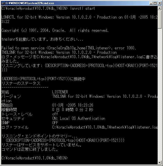 C:\> lsnrctl start サービスの起動に成功すると、「コマンドは正常に終了しました。」というメッセージが表示される。