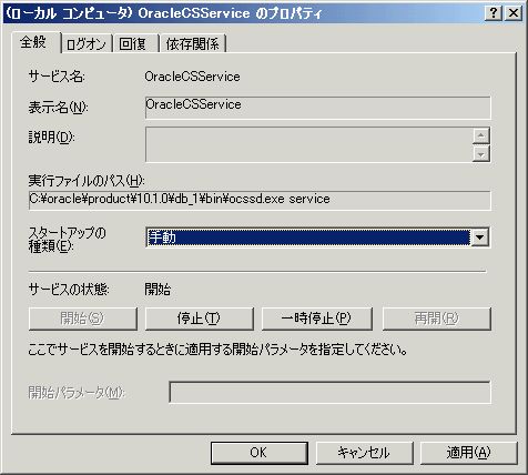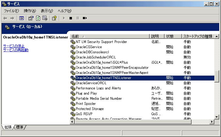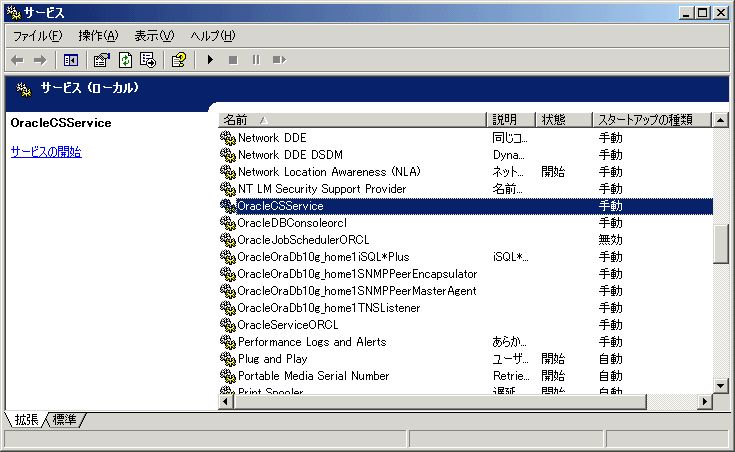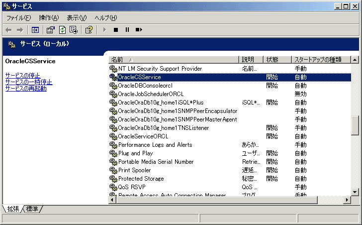 このうち、「OracleDBConsoleorcl」が「Oracle Enterprize Manager 10g」のサービス、「OracleServiceORCL」が「OracleDatabase」の本体である。