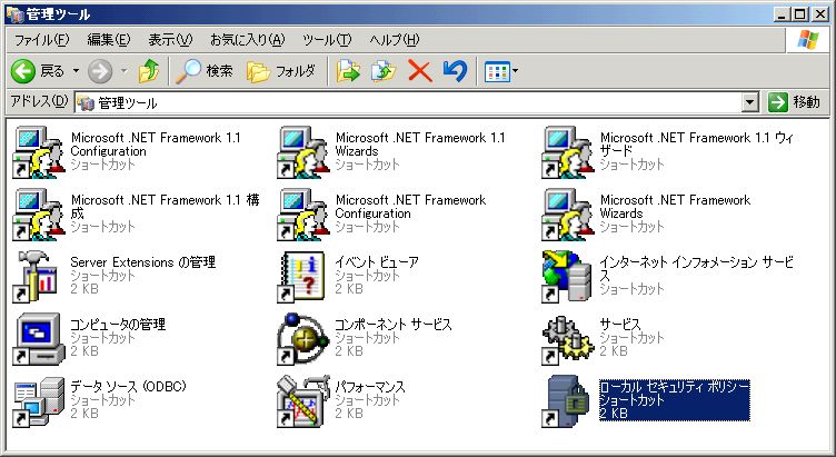 - コントロールパネルから管理ツールを開き、「ローカルセキュリティポリシー」をダブルクリック。
