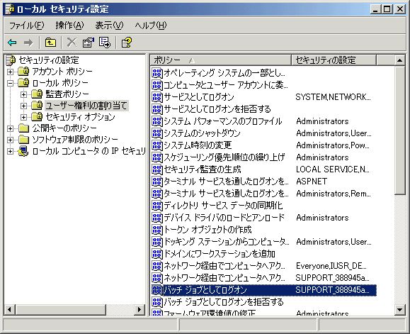 - 「セキュリティの設定」→「ローカルポリシー」→「ユーザー権利の割り当て」を選択し、右側のウィンドウから「バッチ ジョブとしてログオン」を探してダブルクリック