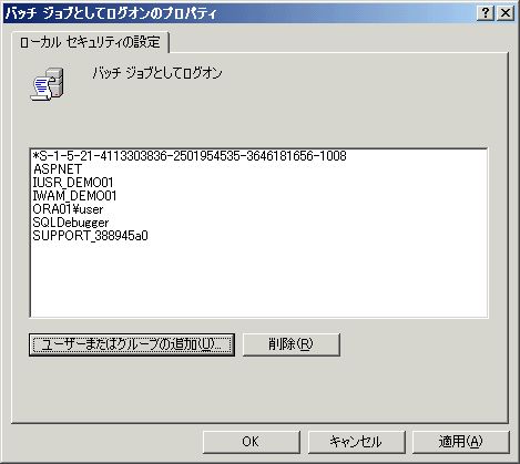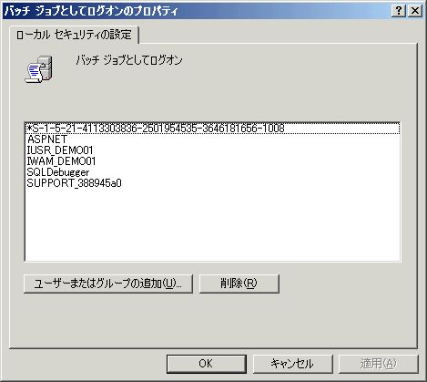 - プロパティウィンドウに戻ると、ユーザーが追加されていることが分かる。「適用」ボタンをクリックしてから「OK」ボタンをクリックし、ウィンドウを閉じる