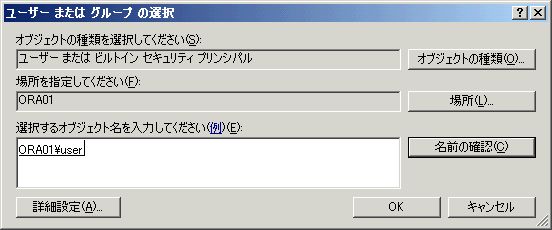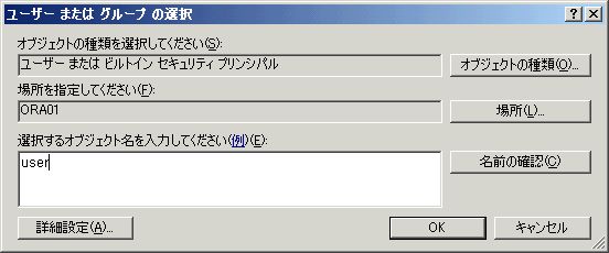 - 「選択するオブジェクト名を入力してください」というところに、Oracleをインストールしたユーザーのユーザー名を入力し、「名前の確認」ボタンをクリック