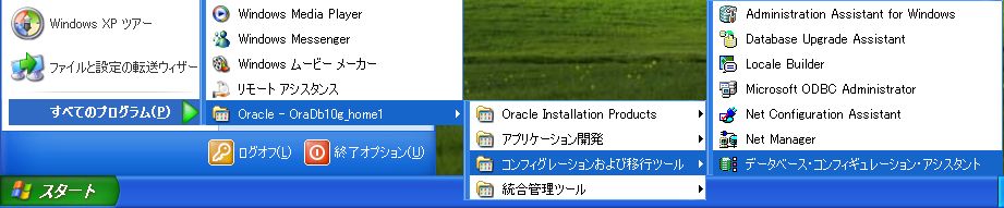 スタートメニューから「すべてのプログラム」→「Oracle - OraDb10g_home1」→「コンフィグレーションおよび移行ツール」→「データベース・コンフィギュレーション・アシスタント」を選び、クリック。