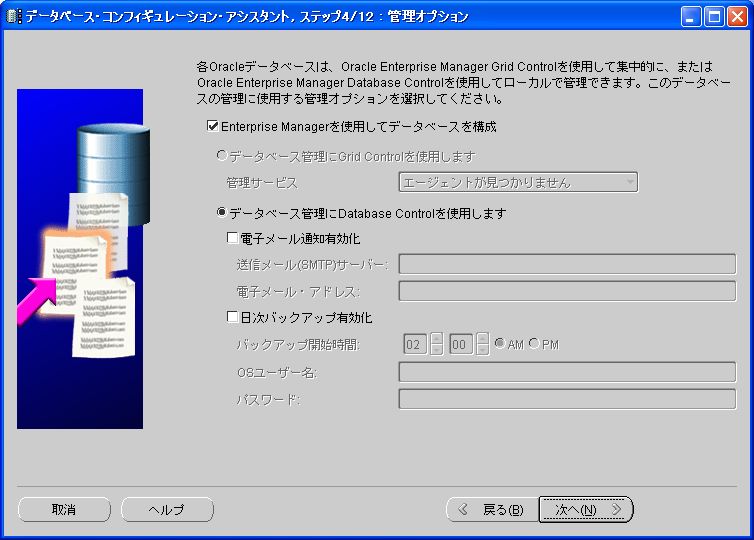 グローバルデータベース名、SID共に「orcl」と入力し、「次へ」をクリック。 2-5 管理オプション