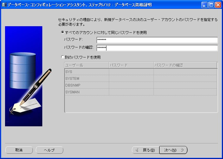 「すべてのアカウントに対して同じパスワードを使用」にチェックが入っていることを確認し、パスワードに「oracle」と入力し、「次へ」をクリック。