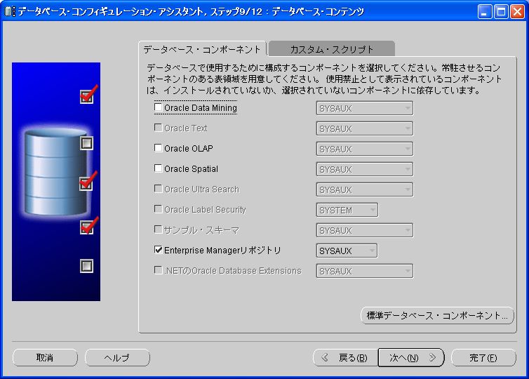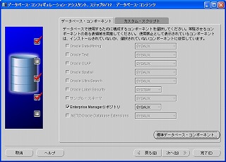「データベース・コンポーネント」タブ内の各コンポーネントのうち、「Enterprise Managerリポジトリ」以外のチェックを全て外す。