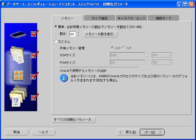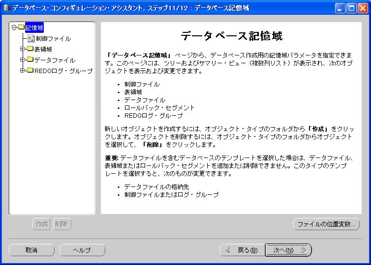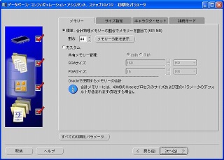 先の警告メッセージ通り、物理メモリの割り当てが調整されているはず。このままの状態で「次へ」ボタンをクリック。 2-15 データベース記憶域