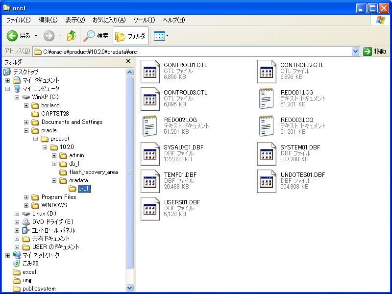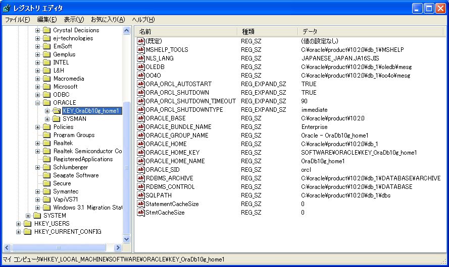 Cドライブのoracleフォルダを確認すると、「C:\oracle\product\10.2.0\oradata」および「C:\oracle\product\10.2.0\admin」内に、SID名で指定した「orcl」という名前のフォルダが作成されていることが分かる。 3-2 レジストリ