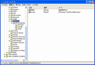 レジストリを確認すると、HKEY_LOCAL_MACHINE → SOFTWARE に「ORACLE」が追加されていることが分かる。 |