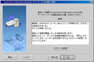 接続テストが失敗する・・・が、エラー内容が「ユーザー名/パスワードが無効です」または「アカウントがロックされています」であれば、設定は正しく行われている。これは、テストに使われるユーザが「SCOTT」または「SYSTEM」となっているからである。自分が持っているユーザでテストすれば成功するはずである。テストしたければ、「ログインの変更」ボタンをクリックし、ユーザ名、パスワードを変更してテストすればよい。