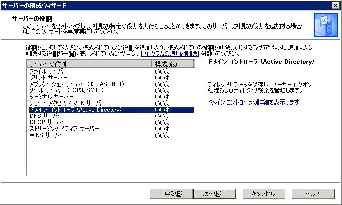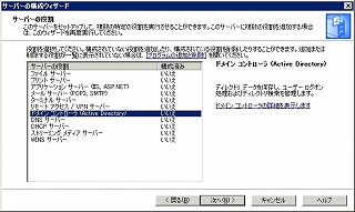 | 「サーバーの役割」から「ドメインコントローラ(Active Directory)」を選択し、「次へ」ボタンをクリック |