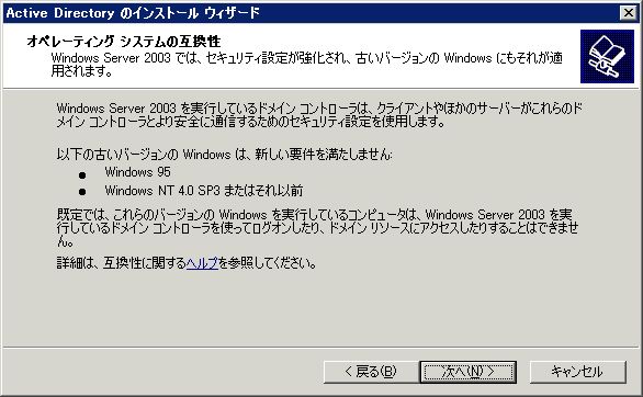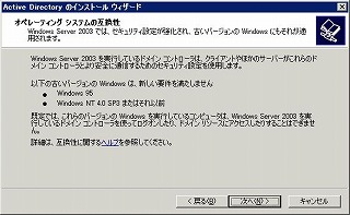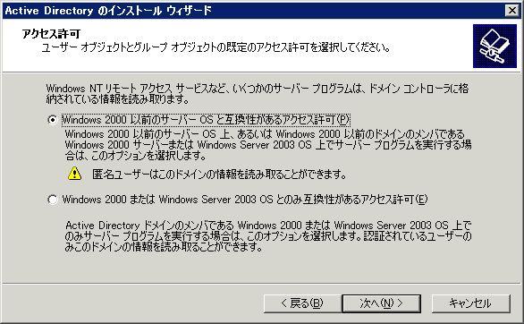| メールサーバ(Postfix)からWinbindを利用してActiveDirectoryを利用するため、「Windows2000以前のサーバーOSと互換性があるアクセス許可」にチェックをつけ、「次へ」ボタンをクリック |