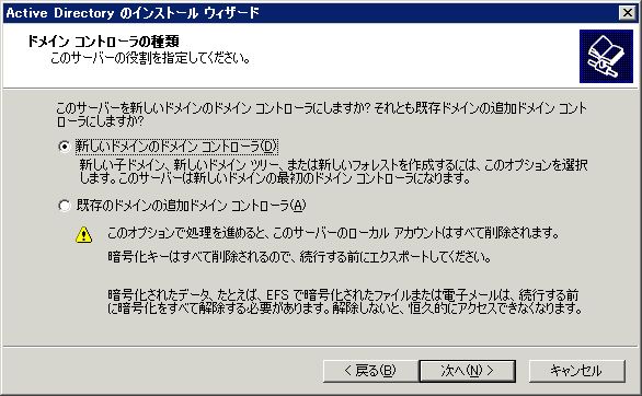 | 新しいドメインを作成するので、「新しいドメインのドメインコントローラ」にチェックが入っていることを確認し、「次へ」ボタンをクリック |