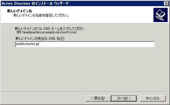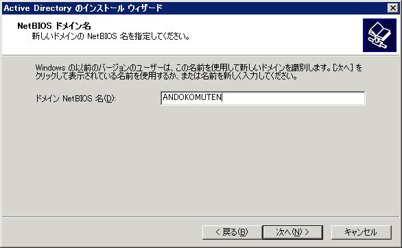 | ドメインのNetBios名が正しく入力されている(例、ANDOKOMUTEN)ことを確認し、「次へ」ボタンをクリック |
