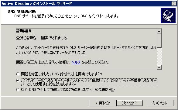 | ActiveDirectoryに参加するクライアント用のDNSサーバを構築するため、「このコンピュータにDNSサーバをインストールして構成し、このDNSサーバを優先DNSサーバとして使用するように設定します。」にチェックをつけ、「次へ」ボタンをクリック |