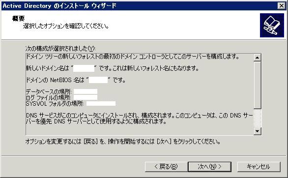 | 内容が正しいことを確認し、「次へ」ボタンをクリック ActiveDirectoryとDNSサーバの構築が行われる |