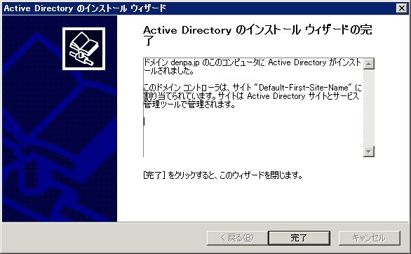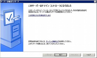 | 再起動後、作成したドメイン(例、ANDOKOMUTEN)にadministratorユーザでログインする。ログイン後、この画面が表示される。 「完了」ボタンをクリック |