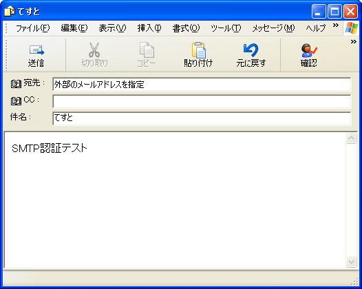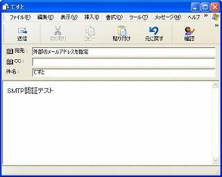 クライアントPCのメーラーを設定し、メールが送受信できるかどうか確認する。まずは今までの設定のままで、外部のメールアドレスに対してメールを作成する。