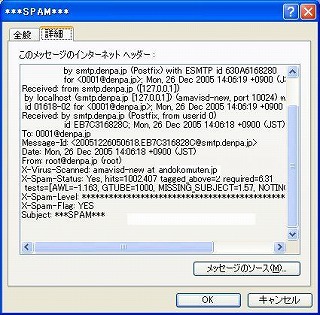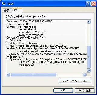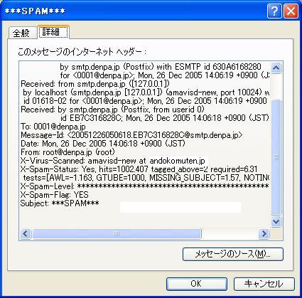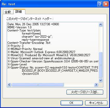 受信したメールが、SpamAssassinを経由しているかどうか確認する。自分宛にメールを送信し、受信したメールのヘッダ情報を見ればよい。Outlook Expressなどで受信したメールを開き、メールのプロパティを表示させると、ヘッダ部分に「X-Spam-xxx」という項目が見つかる。この項目があれば成功。