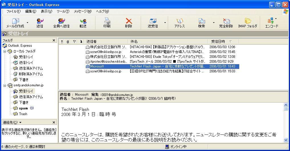 再起動後、スパムメールのチェックをもう一度行う。サーバ側でスパムメールの振り分けを行うため、Outlook Expressで受信できなくなったことが確認できる。