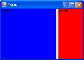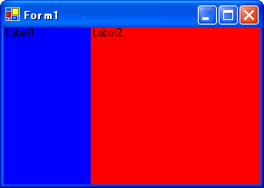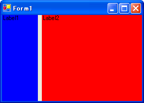 まず、青いラベルを画像のような大きさで配置してDockプロパティをLeftにしてください。次に赤いラベルを適当に配置してDockプロパティをFillにしてください。これだけで自動配置可能な2つのラベルができたことになります。実行してフォームの大きさをいろいろと変えてみてください。