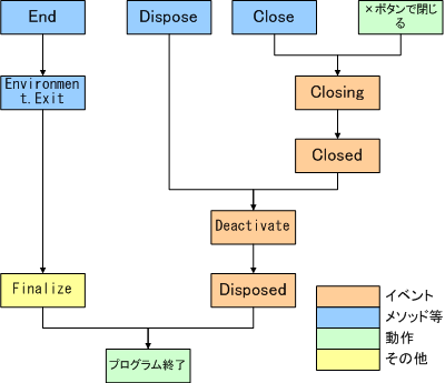 Close以外の方法でプログラムを終了させようとした場合は、ClosingイベントやClosedイベントが発生しません。他にも終了するまでの流れに違いがあります。これらの違いを図にすると次のようになります。