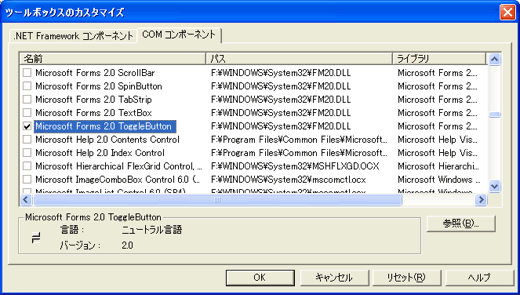 今回は一覧の中からMicrosoft Forms 2.0 ToggleButtonをチェックして[OK]ボタンを押してください。もし、一覧の中にMicrosoft Forms 2.0 ToggleButtonがない場合はあなたの環境ではToggleButtonが使えないと言うことですのでその場合は、ここの説明を読み流してください。多分、OfficeがインストールされていればToggleButtonもインストールされていると思うのですが、私にもよくわかりません。