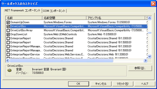 このダイアログ画面のタブで「.NET Framework コンポーネント」が選択されているのを確認して、 一覧の中からDriveListBoxを見つけ出してチェックをつけてから[OK]ボタンをクリックしてダイアログ画面を閉じてください。