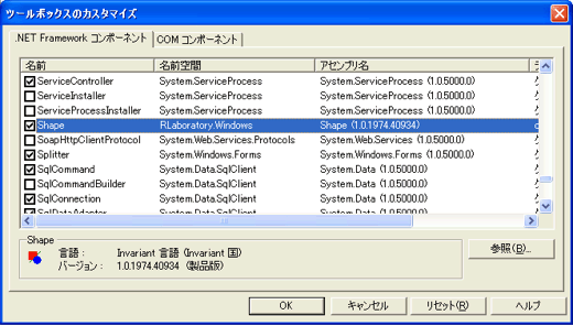 今までと同じ手順で[ツールボックス アイテムの追加と削除...]をクリックして.NETコンポーネントの一覧を表示させてください。今度は[参照]ボタンを押して、先ほどダウンロードしてきたShape.dllの場所を指定してください。