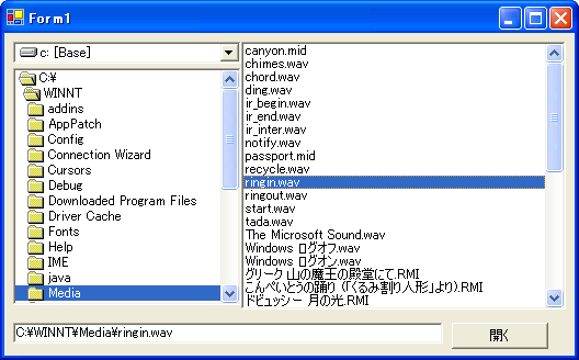 ただ単にファイルを選択できるだけではつまらないので[開く]ボタンをクリックするとそのファイルを実行できるようにします。たとえば、txtファイルを開いたり、mp3を演奏したりできます。