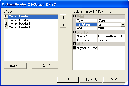 ImageListにImagesを登録したのを同じようなダイアログ画面が開きますのでここに列を追加していきます。[追加]ボタンをクリックするたびに列が1つ増えるので列が4つになるようにしてください。