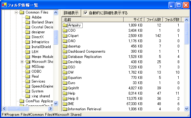 「自動的に詳細を表示する」チェックボックスをチェックしている場合は左側のツリーでフォルダを選択した段階で一覧にフォルダのサイズ・ファイル数・フォルダ数も表示されますが、これらを計算するためには時間がかかりますので注意です。