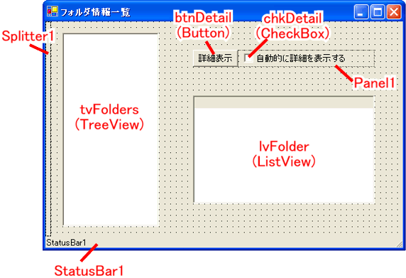 それではメイン機能であるフォルダの詳細表示部分を作りましょう。ツリービューで選択したフォルダの内容をリストビューで一覧表示する機能です。
