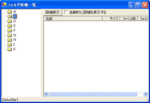 この段階で実行してみるとフォルダツリーにドライブの一覧が表示されてそれらしくなってきます。