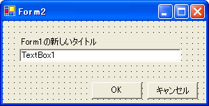 さて、ここでForm2でテキストボックスに入力した文字がForm1のタイトルに表示されるようにします。ただし、Form2で[キャンセル]ボタンがクリックされたときはForm1のタイトルは変更されません。