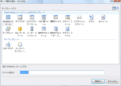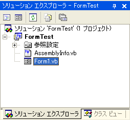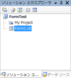 さて、フォームを追加するだけなら実はとても簡単です。VBでプロジェクトを作成する際に「Windows アプリケーション」を選択すれば、はじめからフォームが1つある空のプログラムが作成されます。このとき、ソリューションエクスプローラは次のようになっています。この例ではプロジェクト名を「FormTest」 にしています。