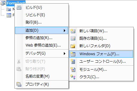 FormTestプロジェクトの上で右クリックして、[追加] - [Windows フォームの追加]をクリックします。