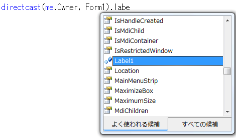 DirectCastを使用すると入力中にちゃんとインテリセンスの中にLabel1が表示されます。「OwnerがForm1のことなんですよ」という情報がちゃんとVBに伝わっている証拠です。