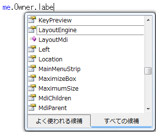 このことはプログラム入力中のインテリセンスを見てもわかります。Me.Owner.Label1と入力しようとしてもインテリセンスの一覧にはLabel1は表示されません。