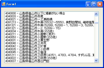 '都道府県名と市区町村名と町域名を結合 ListBox1.Items.Add(PostalCode & " - " & Address) Line = Reader.ReadLine '次の行を読み込む。 Loop Reader.Close() |