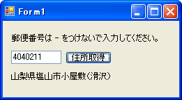 もうちょっと役に立ちそうな例も紹介しましょう。テキストボックスとラベルを配置して、テキストボックスに入力した郵便番号に対応する住所がラベルに表示するようにしてみましょう。完成版のイメージは次の通りです。このプログラムは上記のプログラムをちょっと改造するだけで済むので時間のある方は是非自分でチャレンジして同じものを作ってみてください。