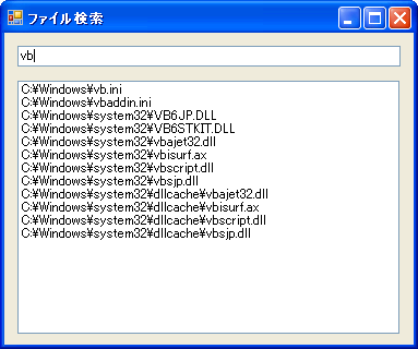 ここまでで登場した機能を使って簡単なファイル検索機能をもったプログラムを作ってみます。このプログラムでは対象のフォルダから、目的のファイルを表す先頭の数文字を入力するとたちまちその条件に合致するファイルの一覧が表示されるというものです。