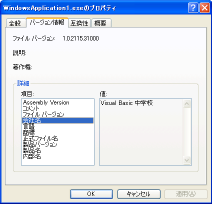 プロジェクトを保存したフォルダを開いてBinフォルダの中を開けてください。この中にあなたが今作成したexeファイルがありますから、そのexeファイルを右クリックしてプロパティを選択してください。そして[バージョン情報]タブの「会社名」をクリックすると見事に「Visual Basic 中学校」という情報が記述されているのがわかります。