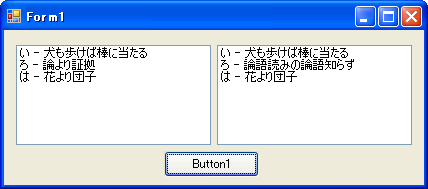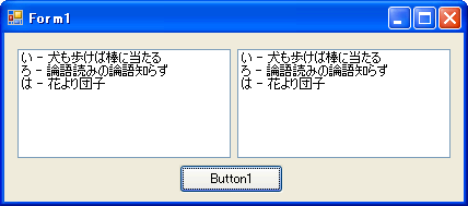 | 'このプログラムは意図したとおりに動作しません! Dim MyArray1 As New ArrayList Dim MyArray2 As ArrayList '▼いろはカルタ パターン1 '値をセット '▼いろはカルダ パターン2 '値をセット '▼表示 ListBox1.Items.AddRange(MyArray1.ToArray) |