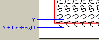 この図で赤い枠が余白の境界です。印刷は赤い枠の内側にしなくてはなりません。さて、この図は「つつつ…」の行を印刷した後の縦位置の計算を表しています。プログラムではDrawStringの次の行でY += LineHeightを実行しています。このY += LineHeightを実行した直後の状態がこの図です。