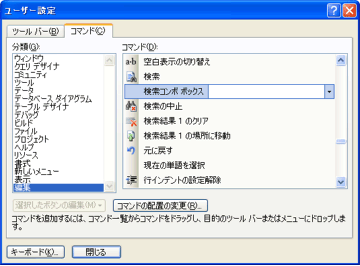 Editionで検索コンボボックスを使用する VB2005 Express Editionの場合は、検索コンボボックスを表示させるのは少々面倒です。まず、[表示] - [ツールバー] - [ユーザー設定]を選択して表示されるウィンドウでコマンドタブの左側にある分類から「編集」を選択し、右側から「検索コンボボックス」を探し出します。項目数が多いのでなかなか検索コンボボックスが見つからないかもしれませんから次の画像のスクロールバーの位置を参考にしてください。